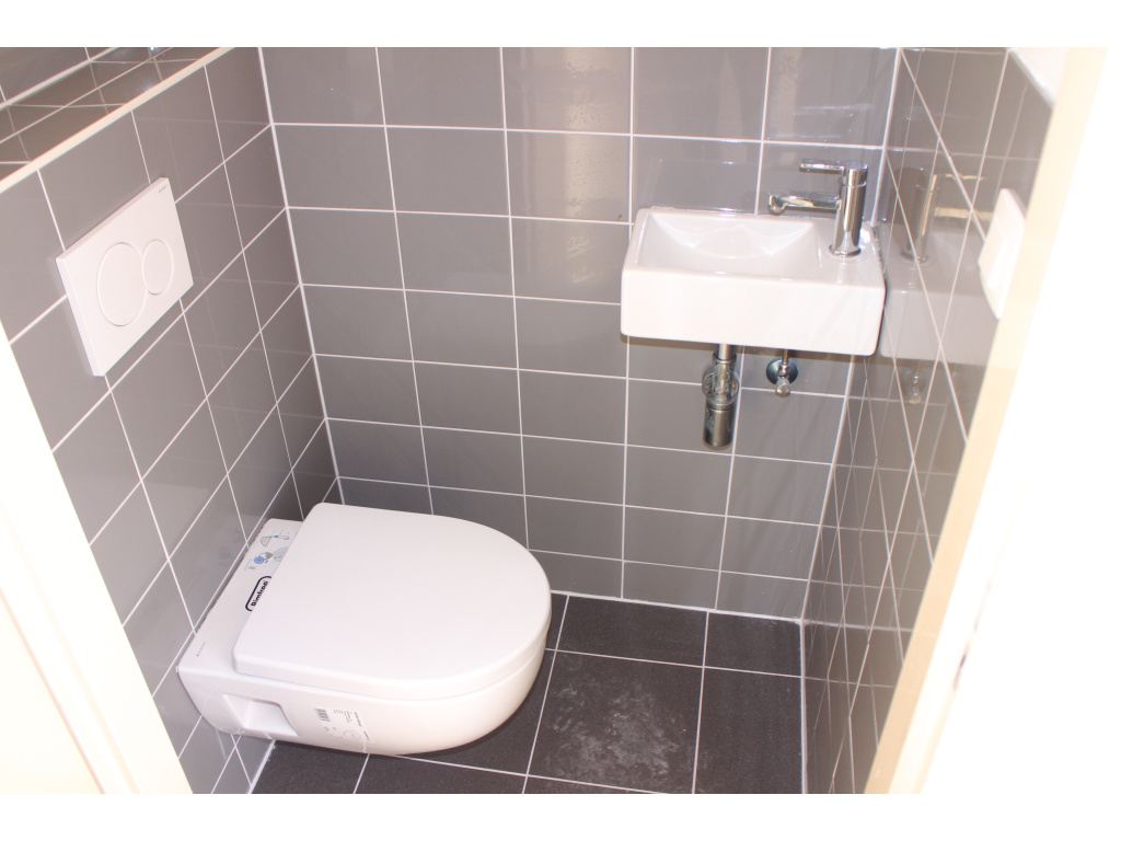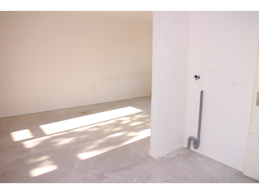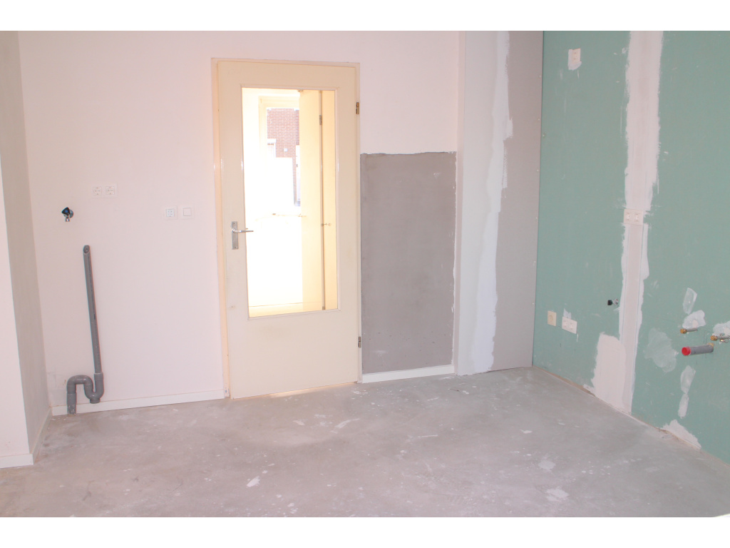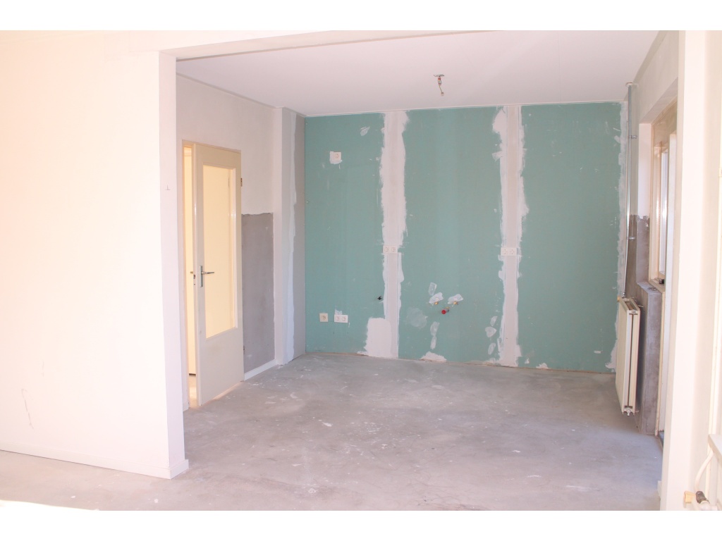 U komt binnen via de hal met vernieuwd toilet, trap naar de verdieping, trapkast en de meterkast (9 groepen en aardlekschakelaars). De muur tussen woonkamer en keuken is verwijderd, wat ruimtelijker overkomt. Er moet nog een keukenblok met apparatuur worden geplaatst. In deze ruimte is ook water en afvoer geplaatst voor de wasmachine.