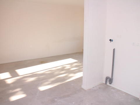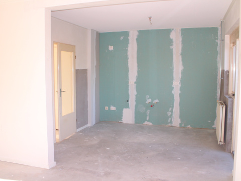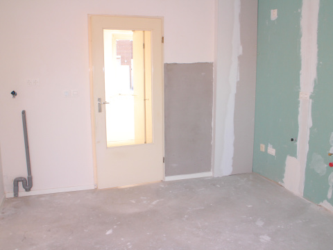 De muren zijn gestukadoord, betonnen begane grondvloer geëgaliseerd.