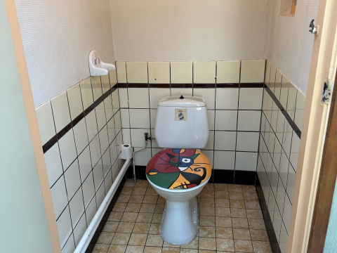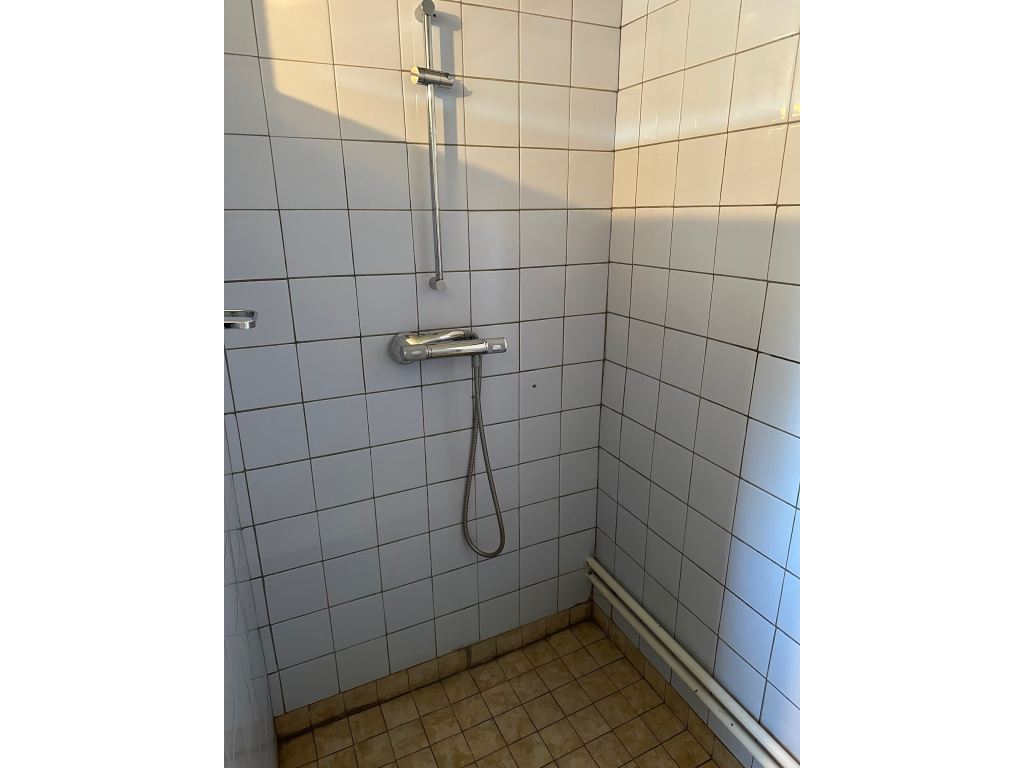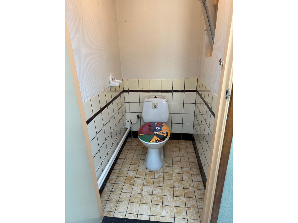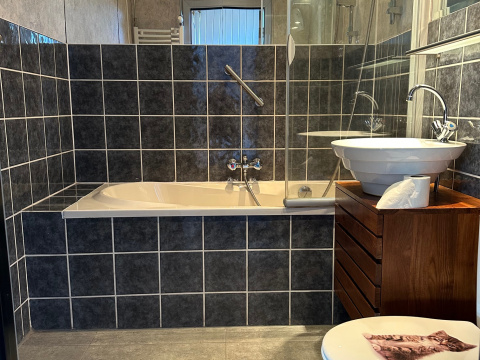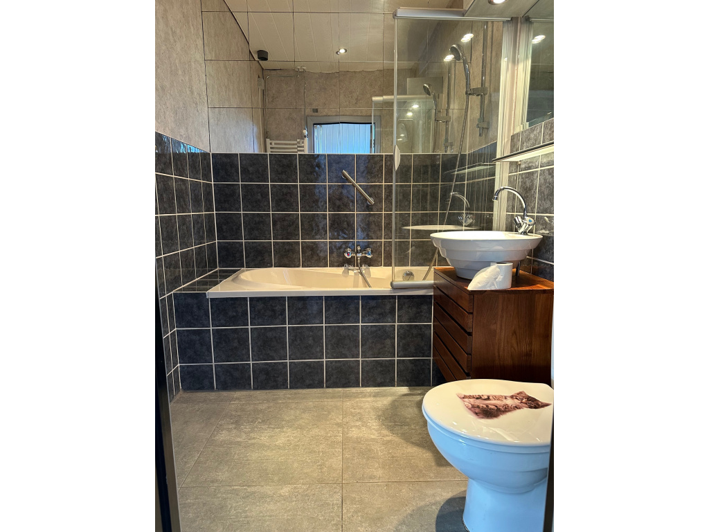 Achter de keuken is de tweede, nette badkamer met ligbad/douche, wastafelmeubel en toilet.