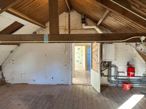 Boven de rechterwoning is een open ruimte, die nog kan worden geïsoleerd en omgebouwd tot woonruimte. Hier is een Intergas HR ketel (2024) geïnstalleerd. Ook zijn hier 2 nieuwe kunststof kozijnen geplaatst.