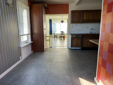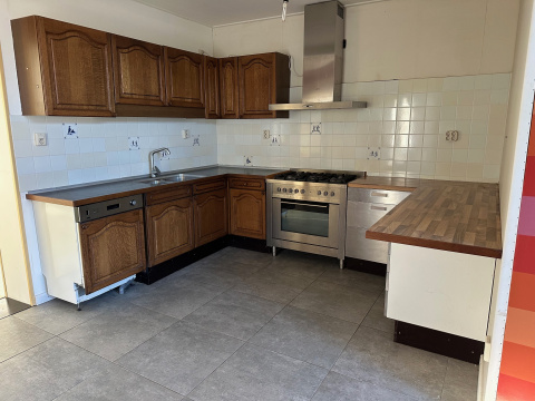 Woonkamer met meterkast (12 groepen en aardlekschakelaars) en aanbouw aan de achterzijde. Hier is een tweede keuken met gaskooktoestel met oven en wasemkap, vaatwasser en dubbele spoelbak.