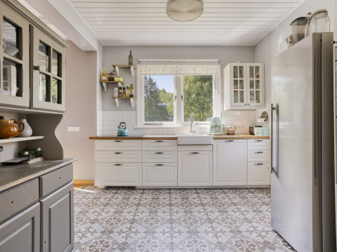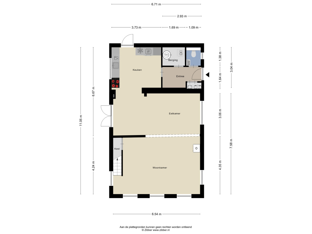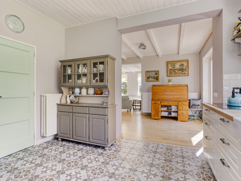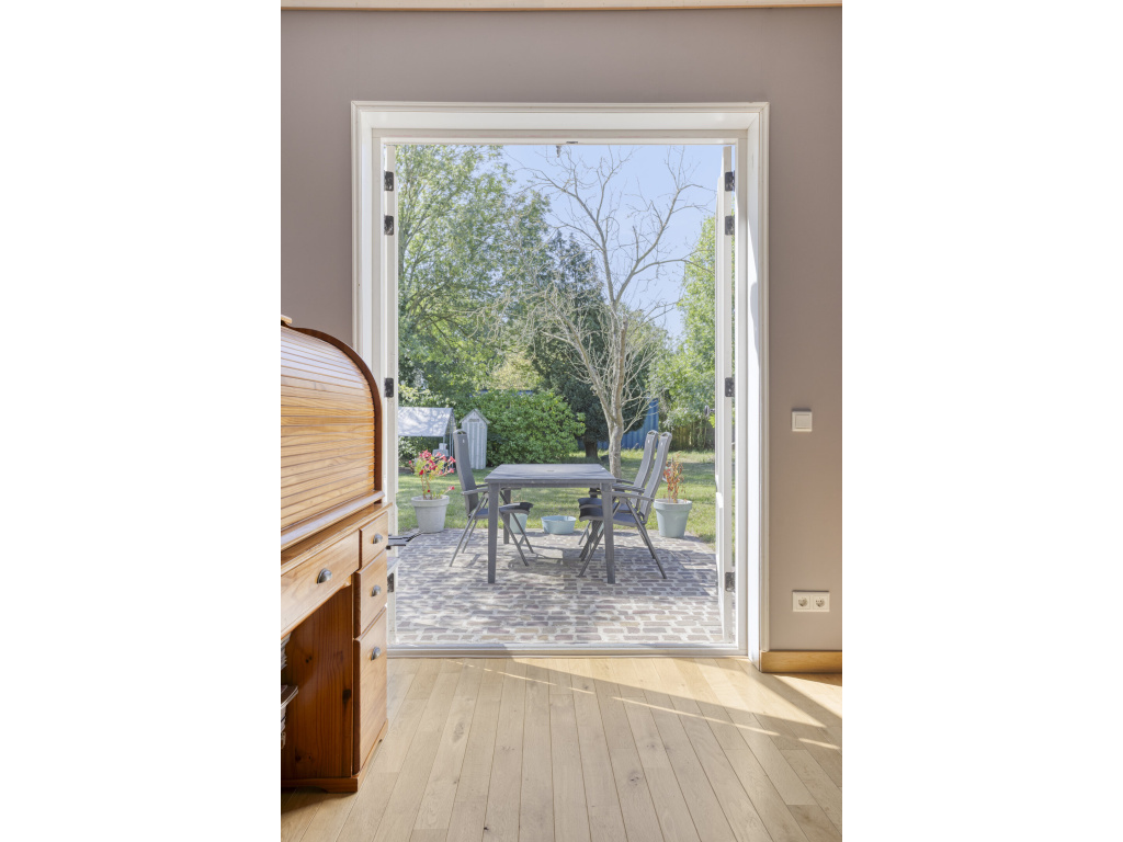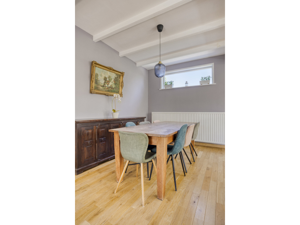 Vanuit de keuken komt u in de eetkamer (20m2) met dubbele tuindeur. Aan de voorzijde is de lichte woonkamer (28m2). Hier is ook een trapkast.