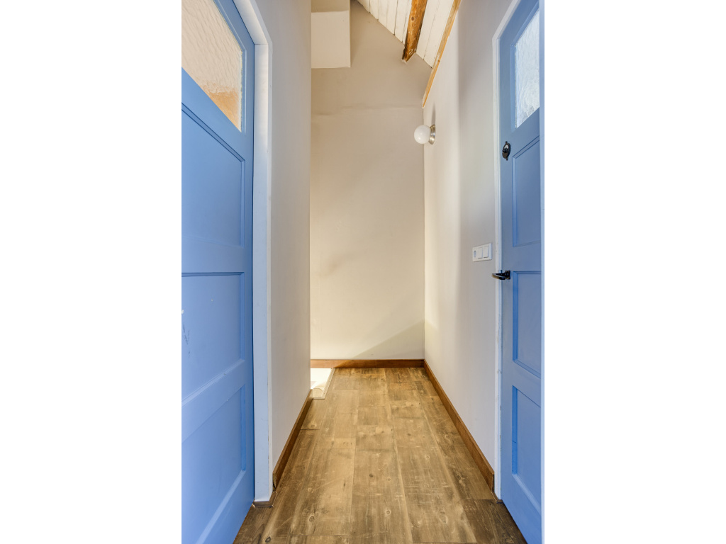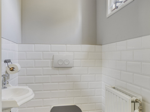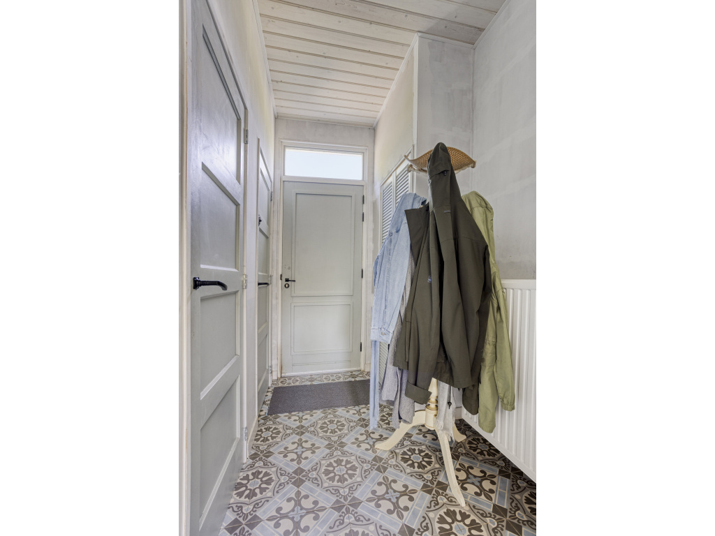 De entree is aan de zijkant van de woning. Hier is een toilet met fonteintje, de nieuwe meterkast en de technische ruimte met warmtepomp, boiler en ruimte voor wasmachine en droger.