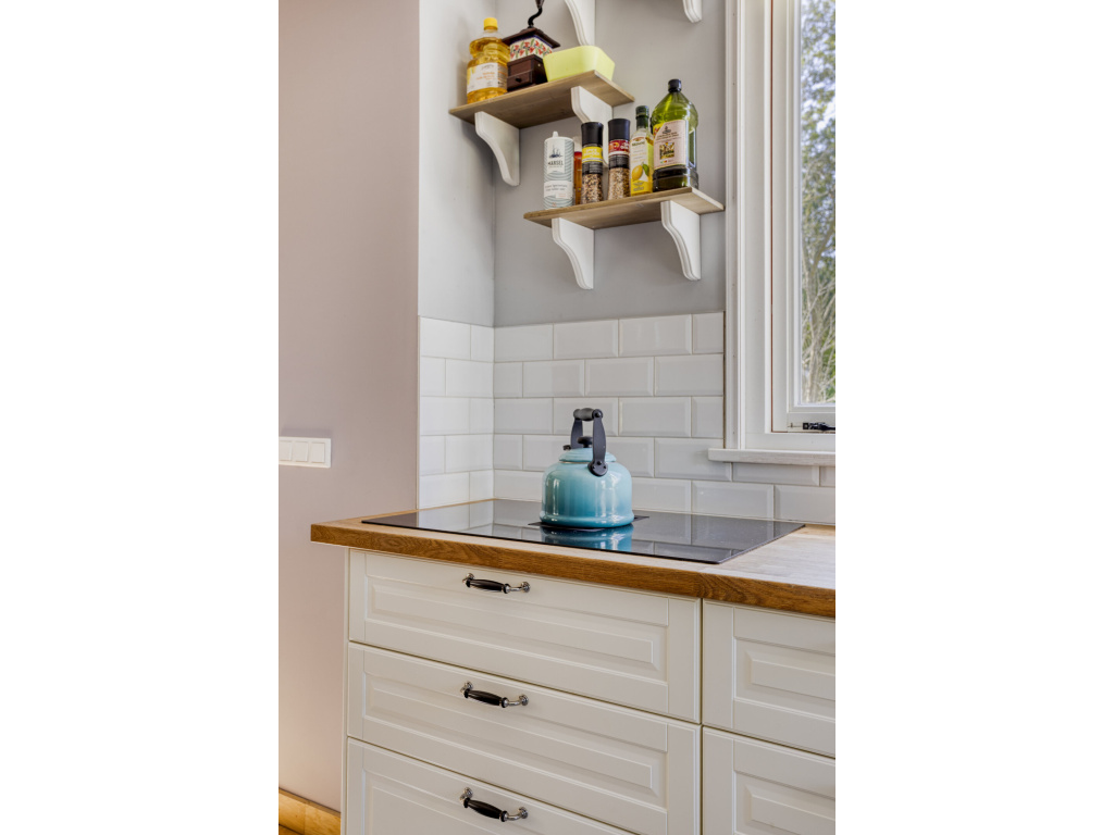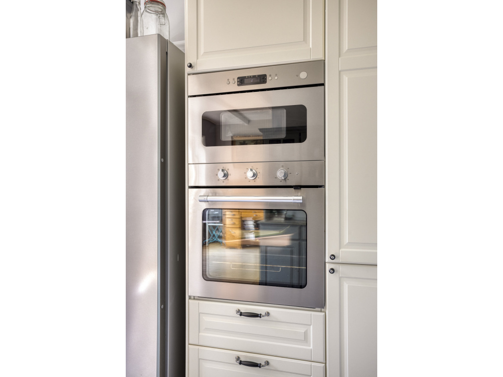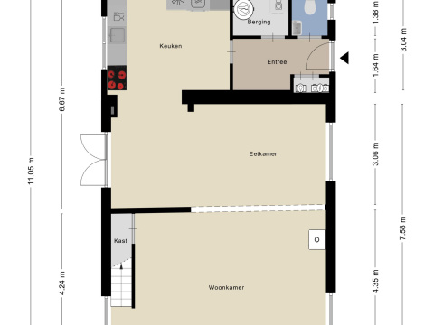 Vanuit de hal komt u in de keuken (11.3m2) met inbouwapparatuur, zoals inductiekookplaat met afzuiging, oven, magnetron en vaatwasser.