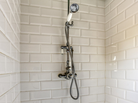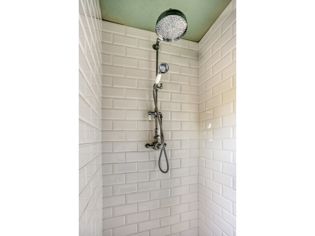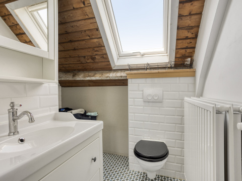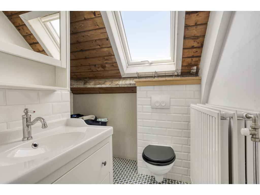 De badkamer is voorzien van een inloopdouche, wastafelmeubel en toilet. Hier is ook een dakraam geplaatst.