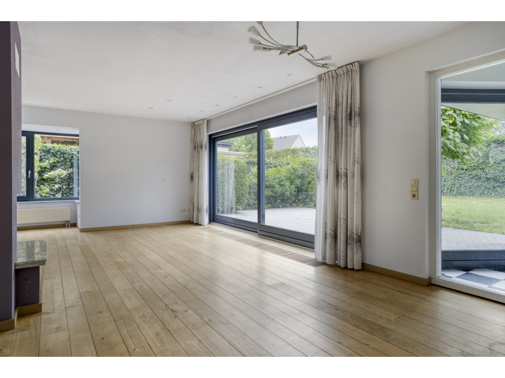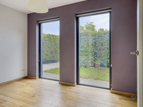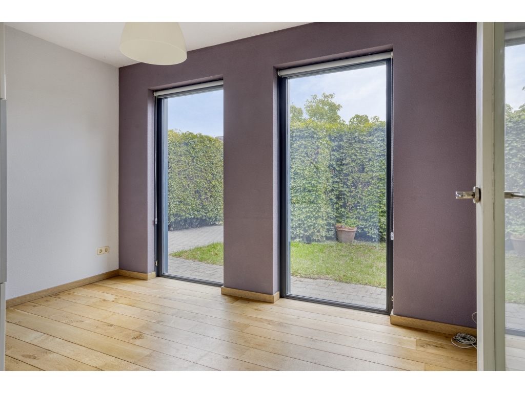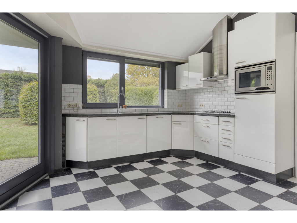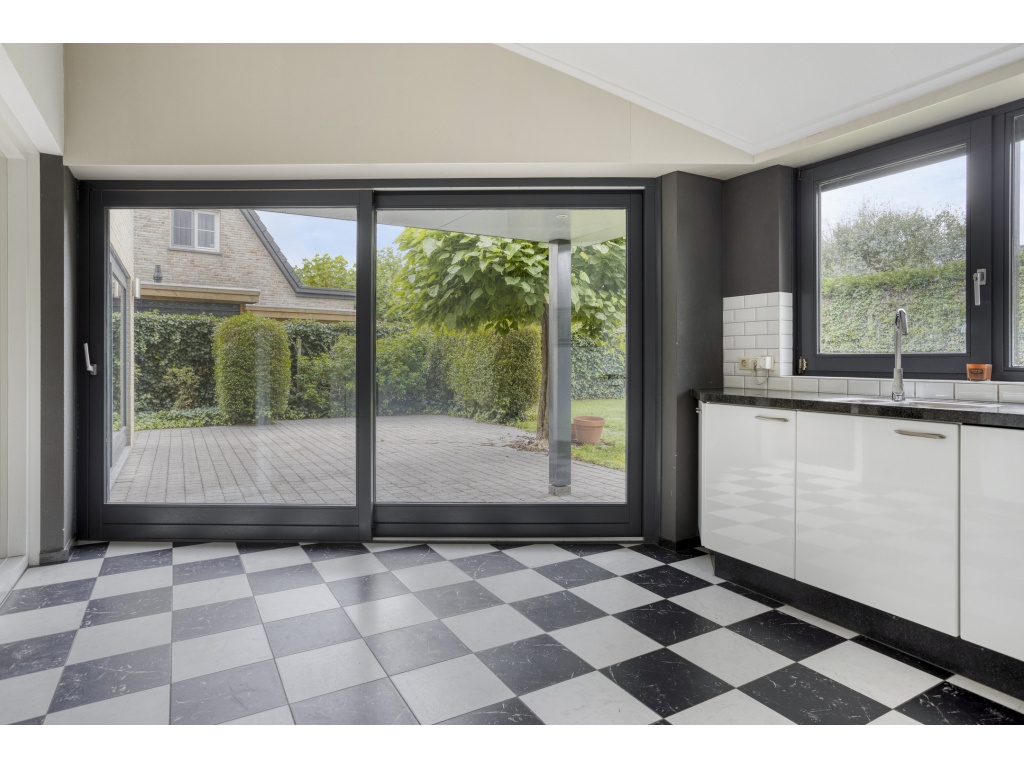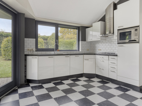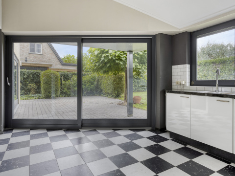 In de woonkamer én in de keuken zijn schuifpuien naar het terras en u hebt een fraai zicht op de tuin. Naast de keuken is de bijkeuken waar de wasmachine, droger en eventueel een vriezer geplaatst kunnen worden. Tevens vindt u hierin een wastafel met warm en koud water.