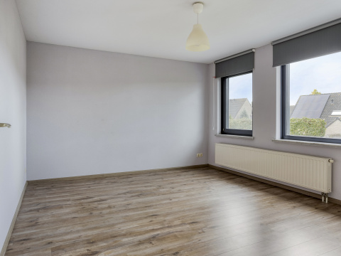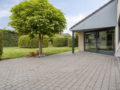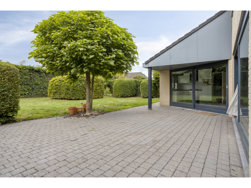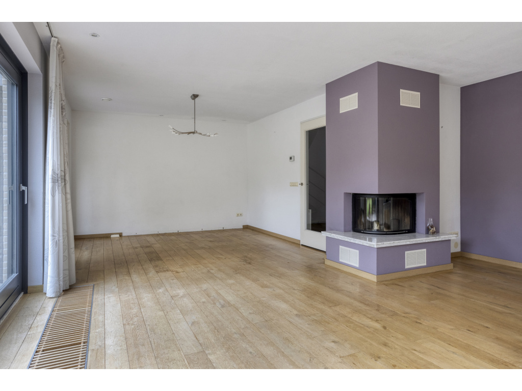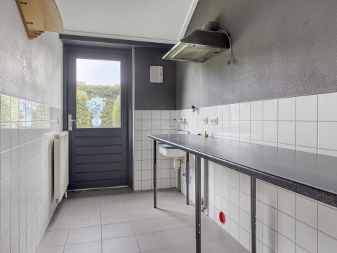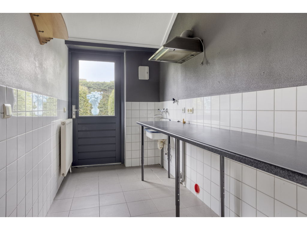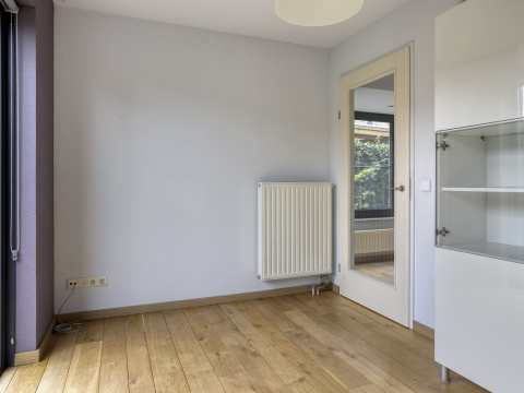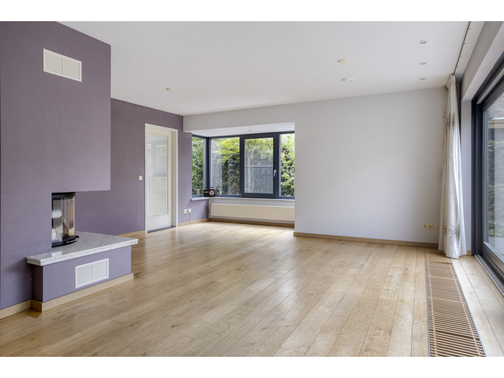 In de woonkamer én in de keuken zijn schuifpuien naar het terras en u hebt een fraai zicht op de tuin. Naast de keuken is de bijkeuken waar de wasmachine, droger en eventueel een vriezer geplaatst kunnen worden. Tevens vindt u hierin een wastafel met warm en koud water.