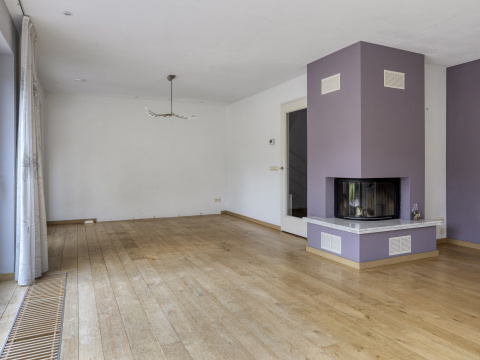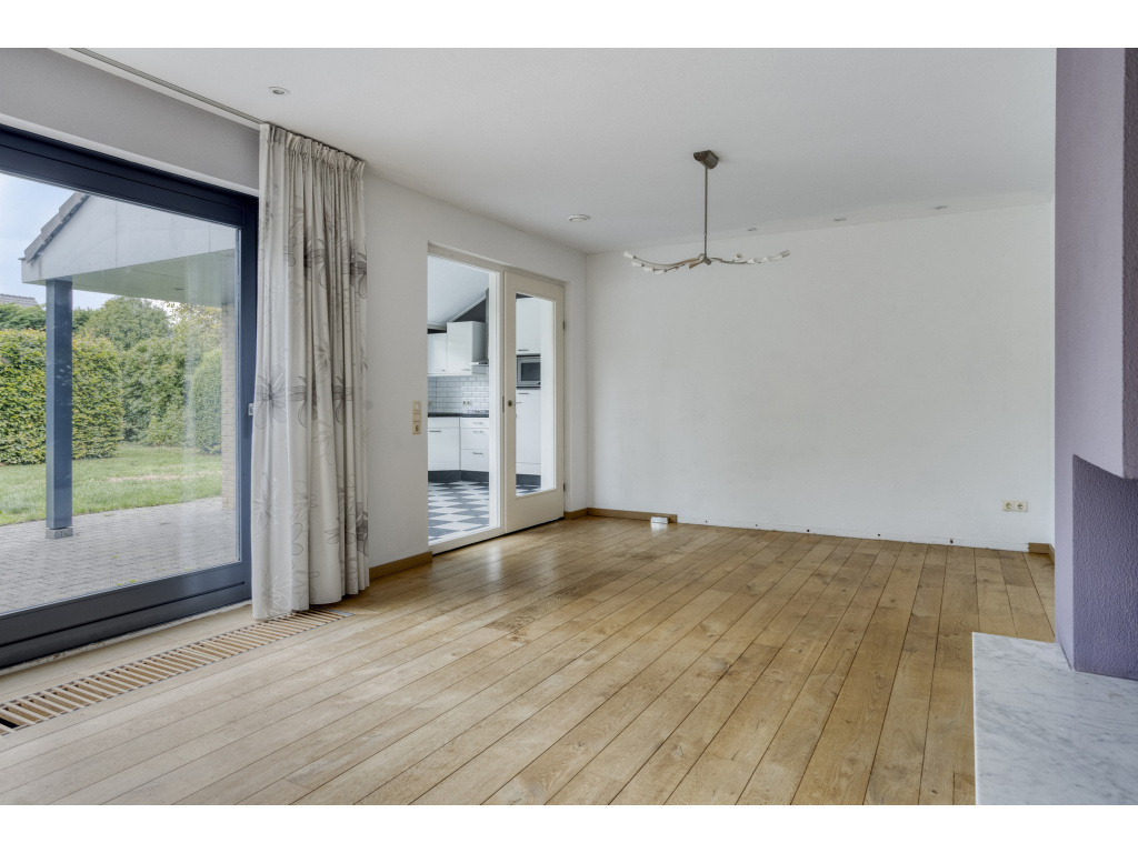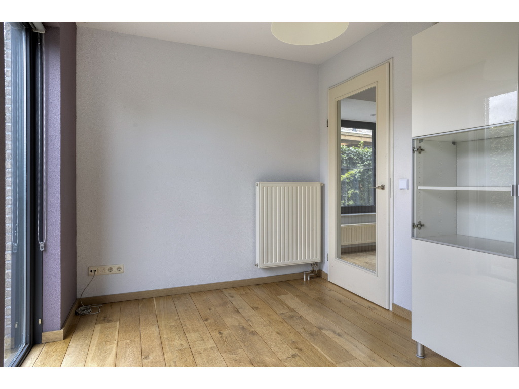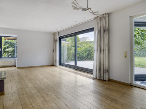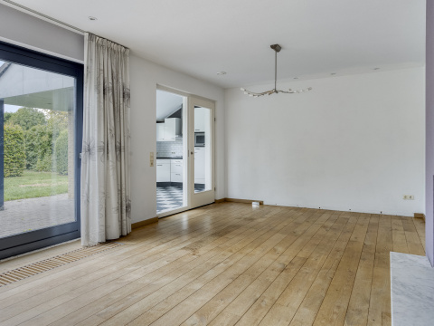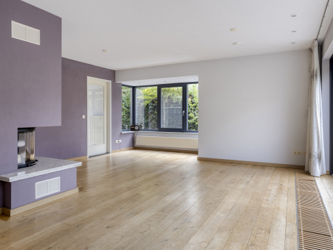 U komt binnen in de ruime hal met toilet, meterkast, garderobekast en de trap naar de eerste verdieping. De ruime L-vormige woonkamer (40 m²) met erker is gericht op de tuin en is voorzien van een eiken parketvloer en plafondspots. In de woonkamer is een moderne open haard. Aan de voorzijde van het huis is nog een studeerkamer (3,75 x 2,55m), eveneens met eiken parketvloer. De aangebouwde woonkeuken heeft diverse inbouwapparatuur zoals koelkast, vaatwasser, gaskookplaat, combimagnetron en wasemkap. De keuken heeft vloerverwarming.
