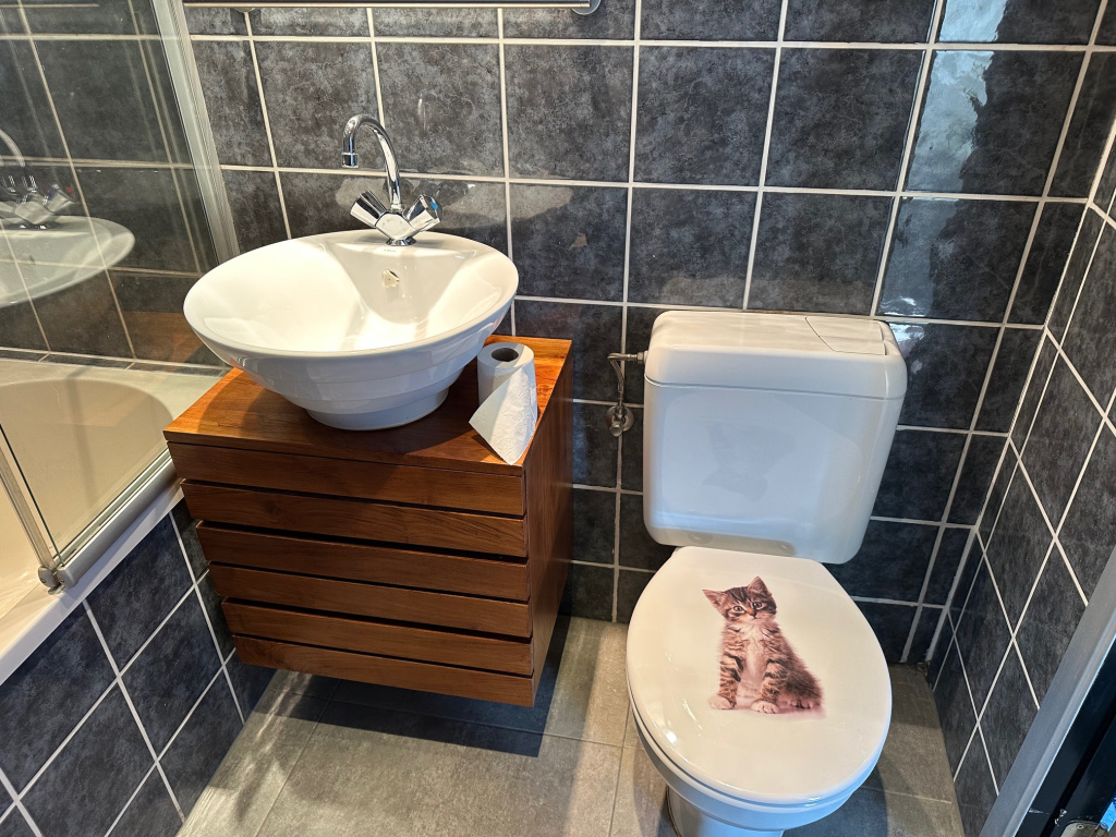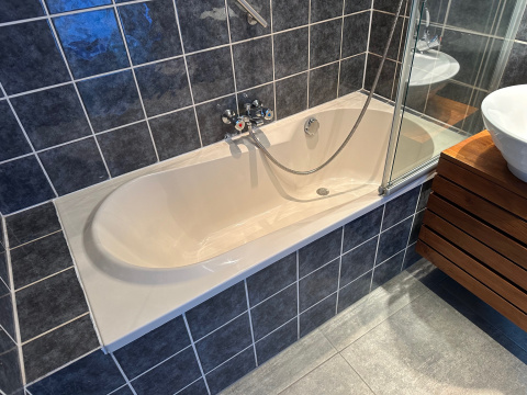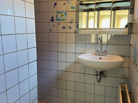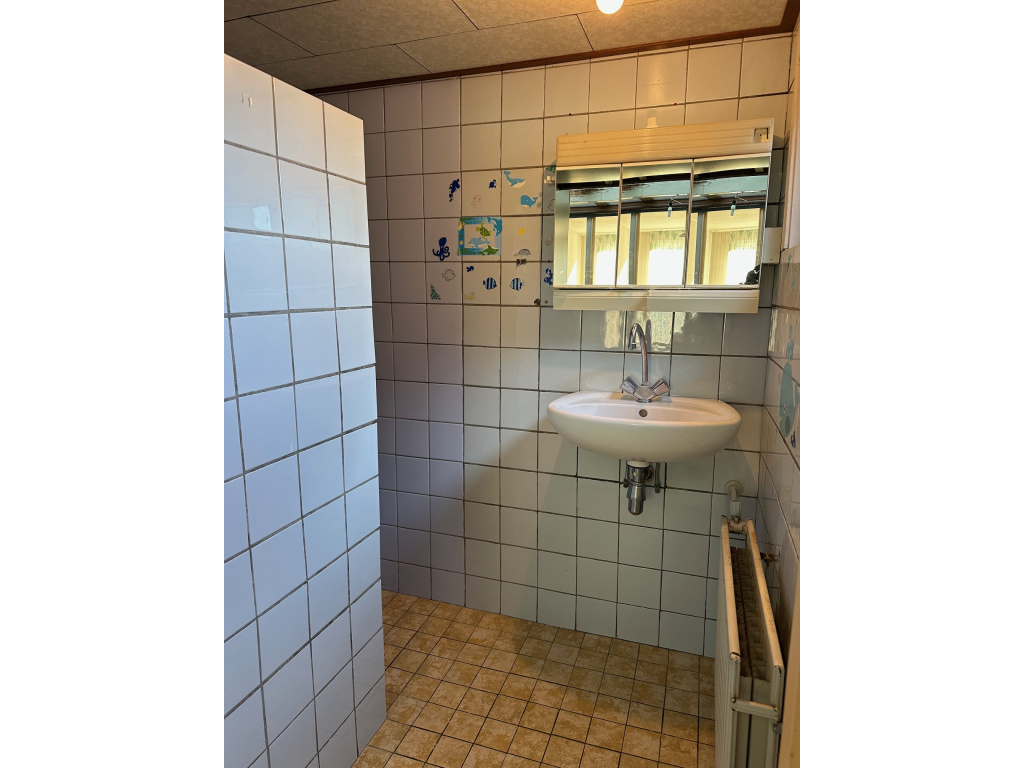 Achter de keuken is de tweede, nette badkamer met ligbad/douche, wastafelmeubel en toilet.
