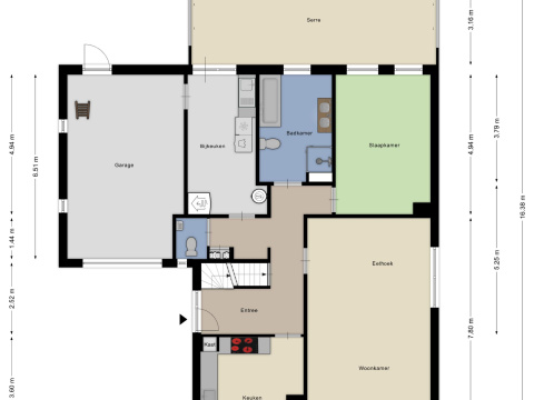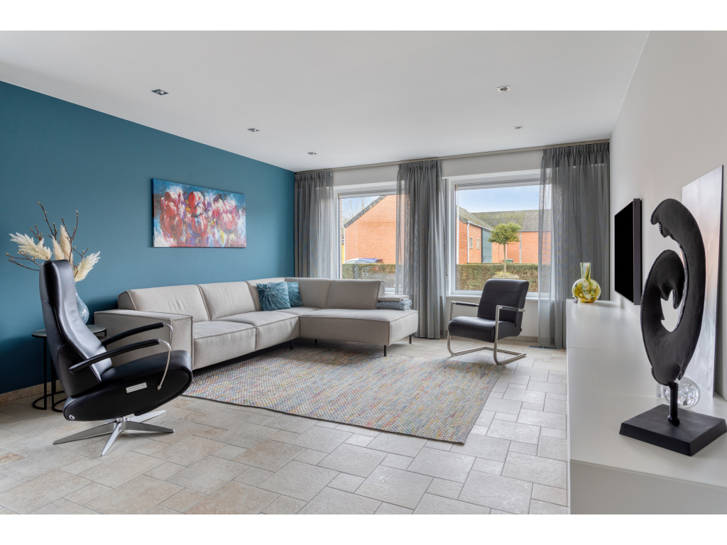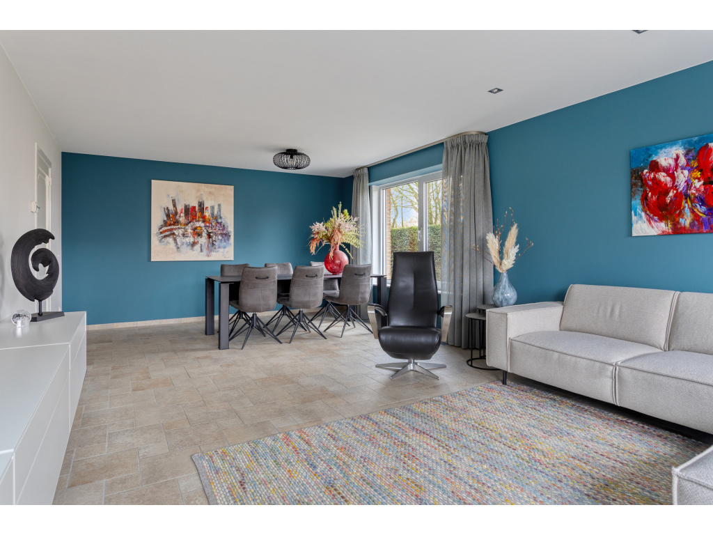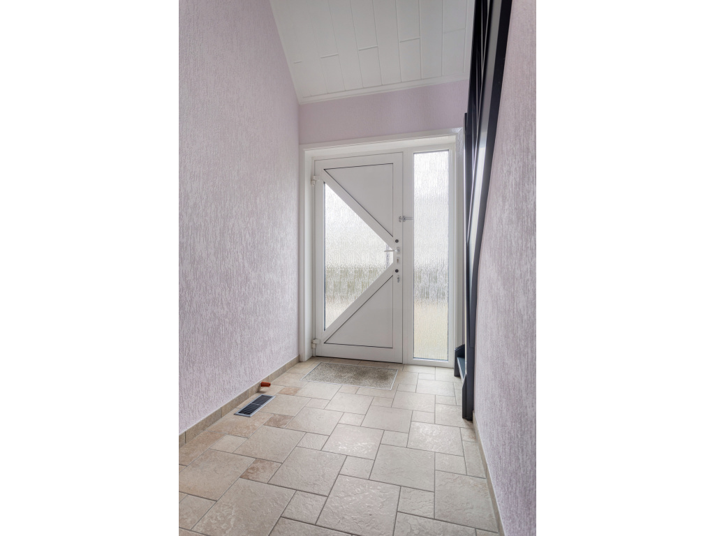 Ruime hal, toilet, meterkast (2018), kelderkast, trap naar de eerste verdieping en aan de voorzijde de keuken (13m2) en ruime woonkamer (34m2).
