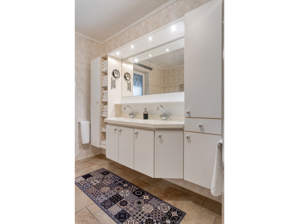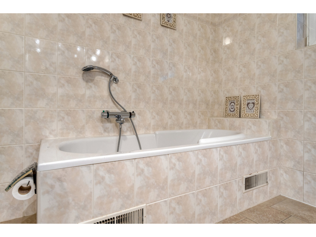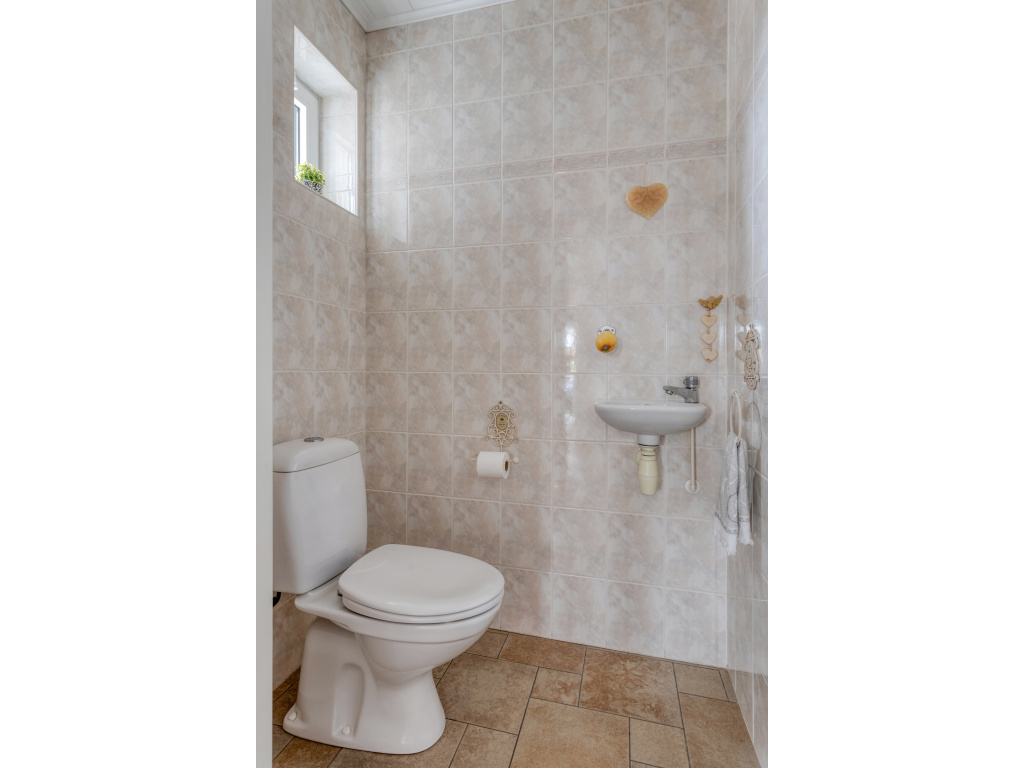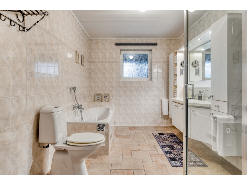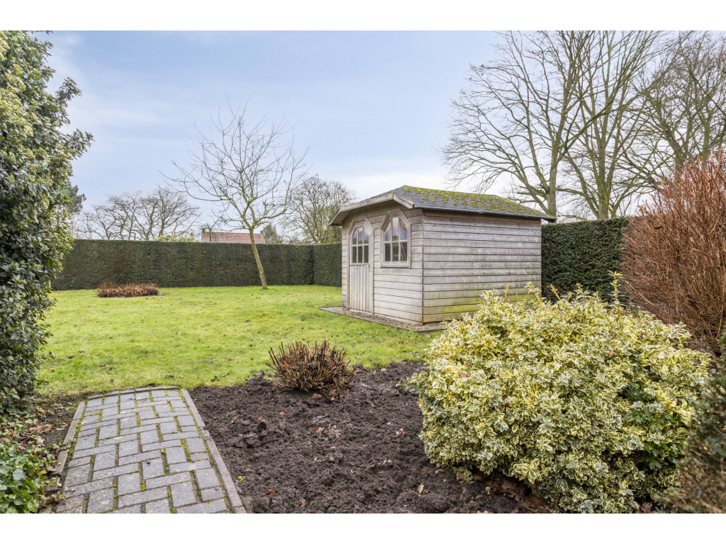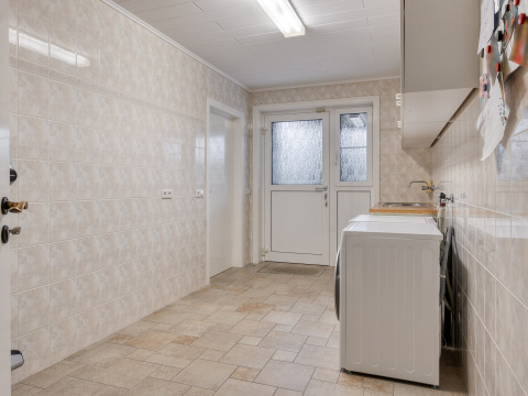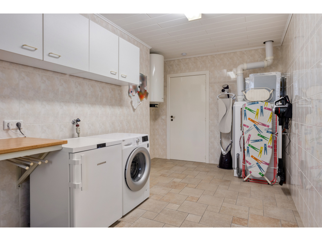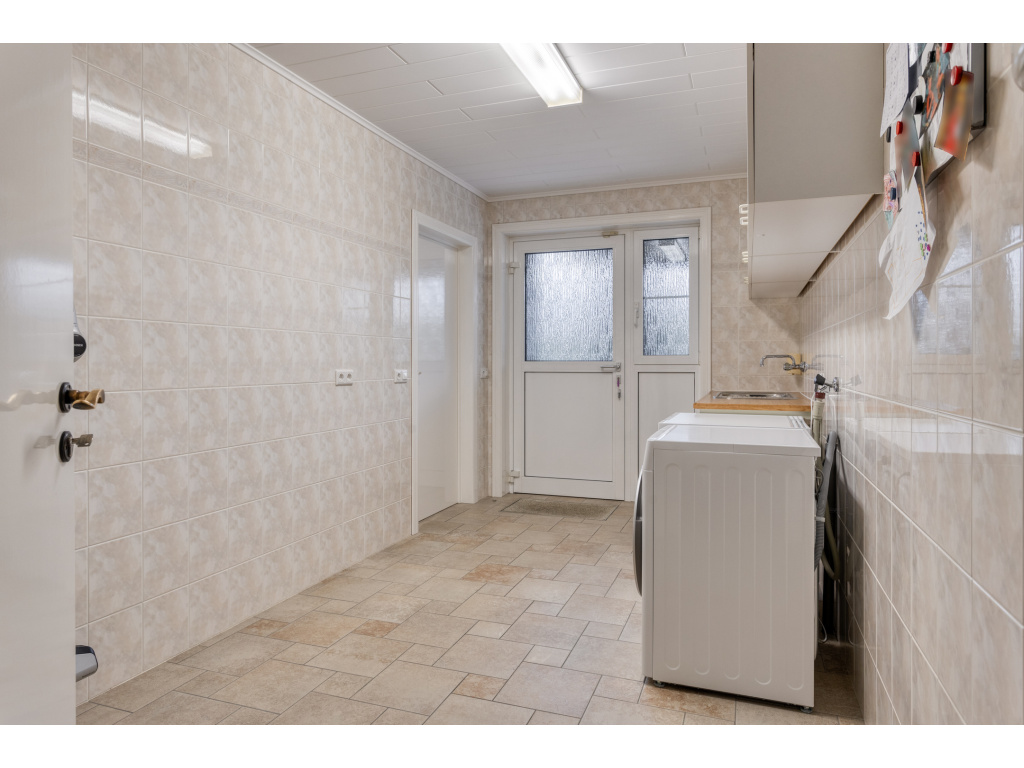 Aan de achterzijde is de bijkeuken (12m2) met aansluitingen voor wasmachine en droger, de verwarmingsketel (Brink 2018) en de boiler. Hier is ook de doorgang naar de garage (26m2) en naar de tuinkamer/serre (27m2). De badkamer bevindt zich aan de achterzijde van de woning en is voorzien van een ligbad, dubbel wastafelmeubel, douchecabine en toilet. Naast de badkamer is de slaapkamer (16.5m2)