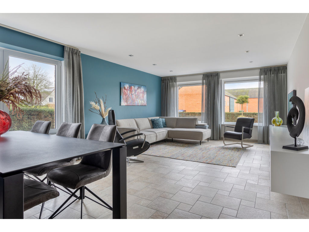 Nette tegelvloer op de begane grond, laminaatvloer op verdieping.
