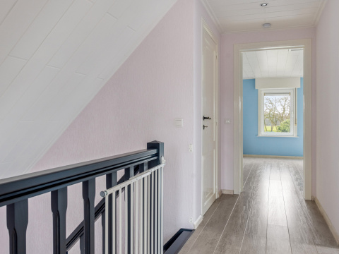 Op de eerste verdieping is een ruime overloop met toegang tot 3 slaapkamers (10, 22 en 27m2) en een bergkast.