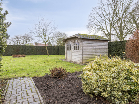 Grote, diepe achtertuin (44x17m) op het Zuiden met houten tuinhuis (9m2) en aangebouwde tuinkamer achter de woning.