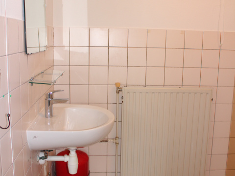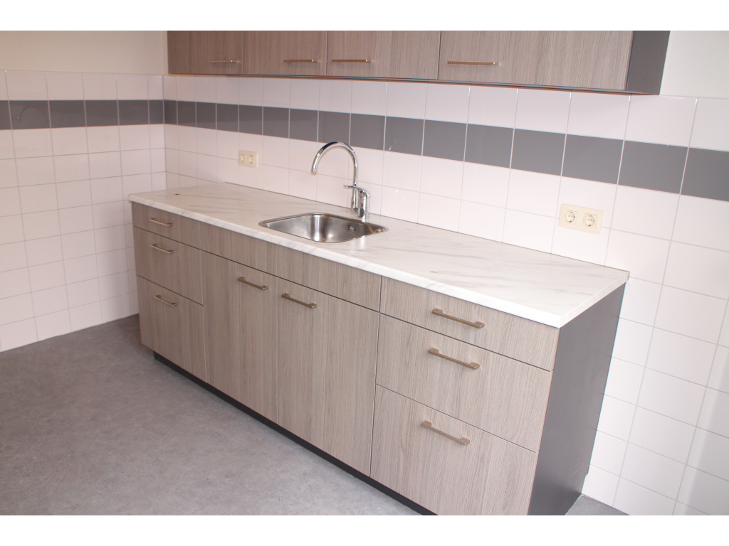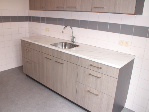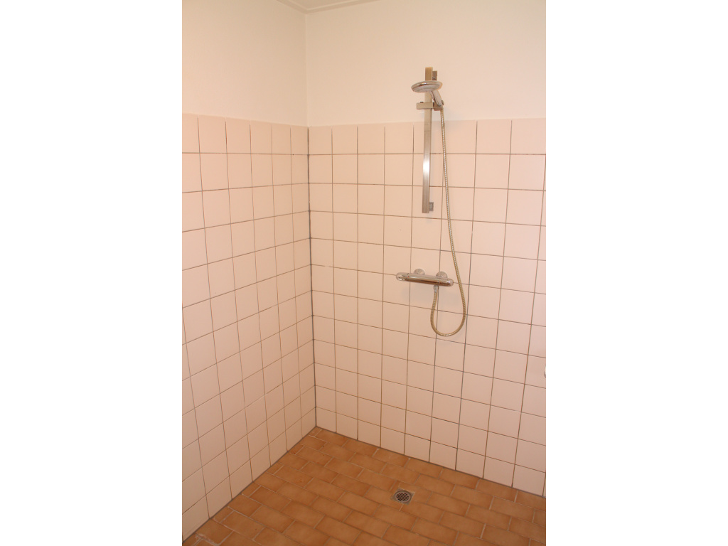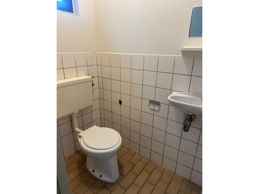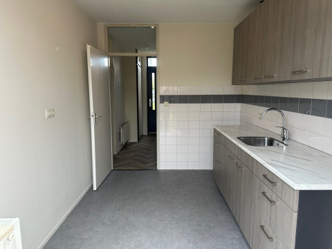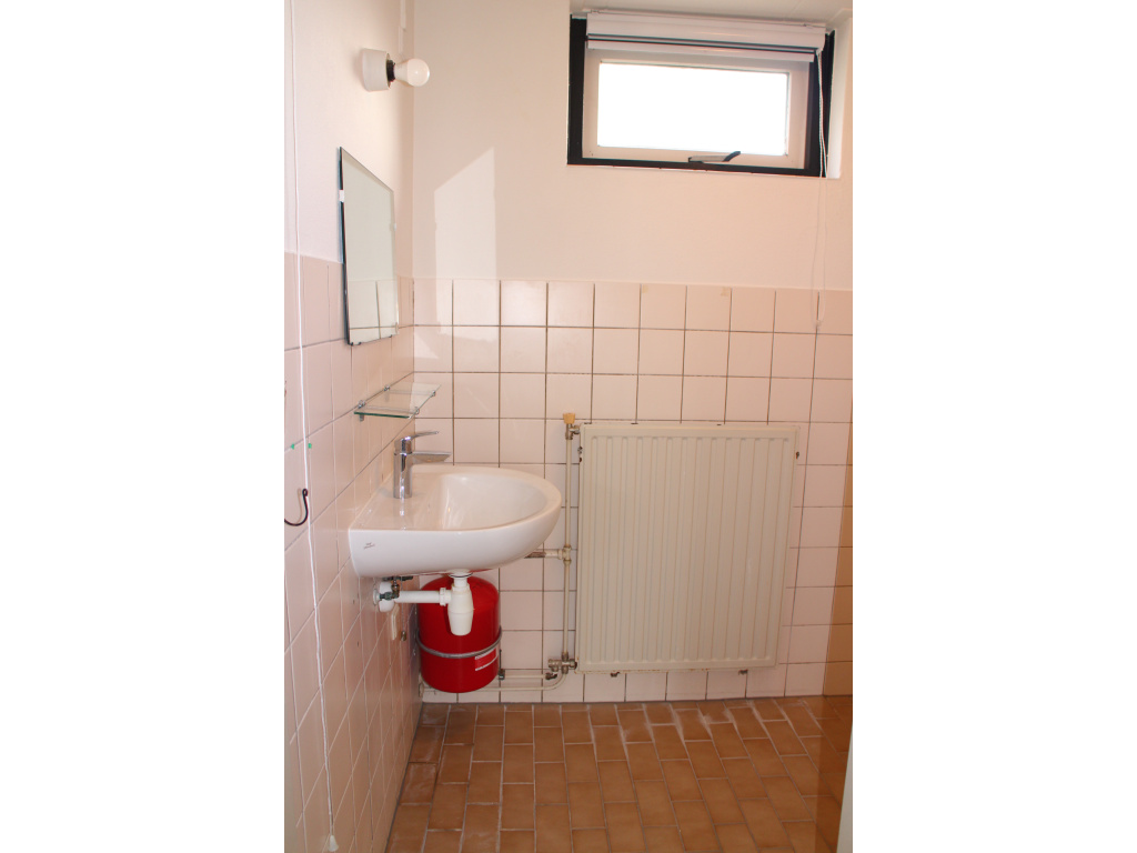 Hal met toilet, trap naar de verdieping, trapkast en meterkast (5 groepen en 1 aardlekschakelaar). Keuken met keukenblok en bovenkasten. Ruimte en aansluiting voor een elektrisch kooktoestel.