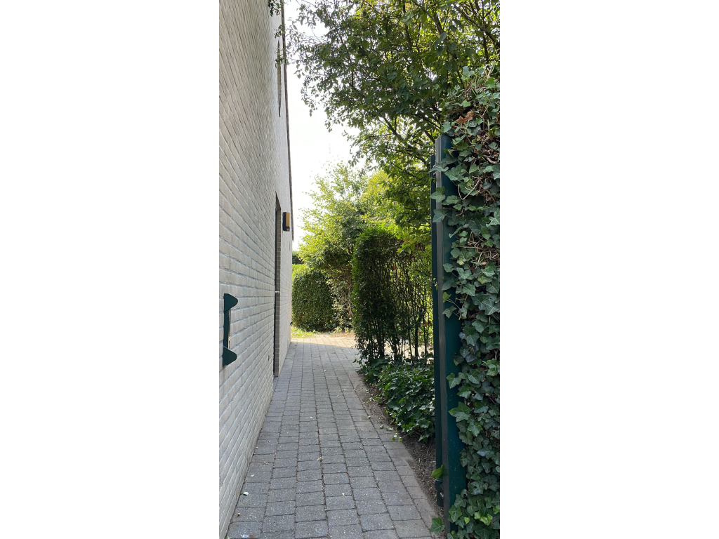 In de woonkamer én in de keuken zijn schuifpuien naar het terras en u hebt een fraai zicht op de tuin. Naast de keuken is de bijkeuken waar de wasmachine, droger en eventueel een vriezer geplaatst kunnen worden. Tevens vindt u hierin een wastafel met warm en koud water.